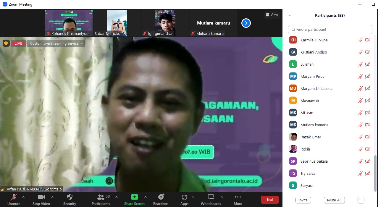 Kamis (16/02/2023)| Moderasi Beragama telah menjadi kajian penting dalam dunia akademisi, pada kesempatan ini Ketua Rumah Moderasi Beragama IAIN Sultan Amai Gorontalo berkesempatan hadir secara virtual dalam kegiatan Kuliah Umum yang berkonsep Webinar Nasional Session 2 bertajuk “Moderasi Beragama: Syiar Keagamaan, Kemanusiaan dan Kebangsaan”. Moderasi beragama perspektif Islam bahwa setiap manusia harus menjaga ukhuwah wathaniyah, ukhuwah Islamiyah dan ukhuwah basyariyah, dari hal tersebut ditegaskan tidak religious seseorang, jika orang tersebut tidak sensitif dengan penderitaan sesama umat manusia. “ungkapnya.