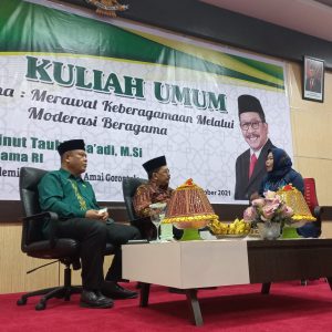 Wakil menteri Agama RI. Zainut Tauhid Sa’adi Kamis, 28 Oktober 2021 memberikan Kuliah Umum di depan Civitas Akademika IAIN Sultan Amai Gorontalo. Kuliah dengan topik memperkokoh keberagamaan melalui Moderasi beragama tersebut di buka dengan Sambutan Rektor IAIN Sultan Amai Gorontalo Zulkarnain Suleman. Atasnama Civitas akademika IAIN Sultan Amai Gorontalo Rektor menyampaikan terimakasih dan bangga atas kunjungan Wakil Menteri Agama di Kampus hijau ini. Kampus yang terus mengembangkan kualitas layanan pendidikan kearah yang lebih baik. Dalam kuliah umumnya Wakil Menteri Agama tersebut menegaskan bahwa Keberagaman adalah sunnatullah olehnya perlu dirawat bersama. Keragaman suku, agama, etnik dan bahasa yang disatukan dalam wujud Bhineka Tunggal ika adalah anugrah Maha Kuasa yang patut di syukuri, tegasnya. Keunikan keragaman bangsa ini patut di pertahankan apalagi di tengah kondisi yang makin tidak menentu. Kuliah yang diikuti secara terbatas oleh civitas akademika dengan protokol kesehatan. Kuliah diakhiri dengan dengan wawancara bersama Humasa IAIN Sultan Amai Gorontalo.
